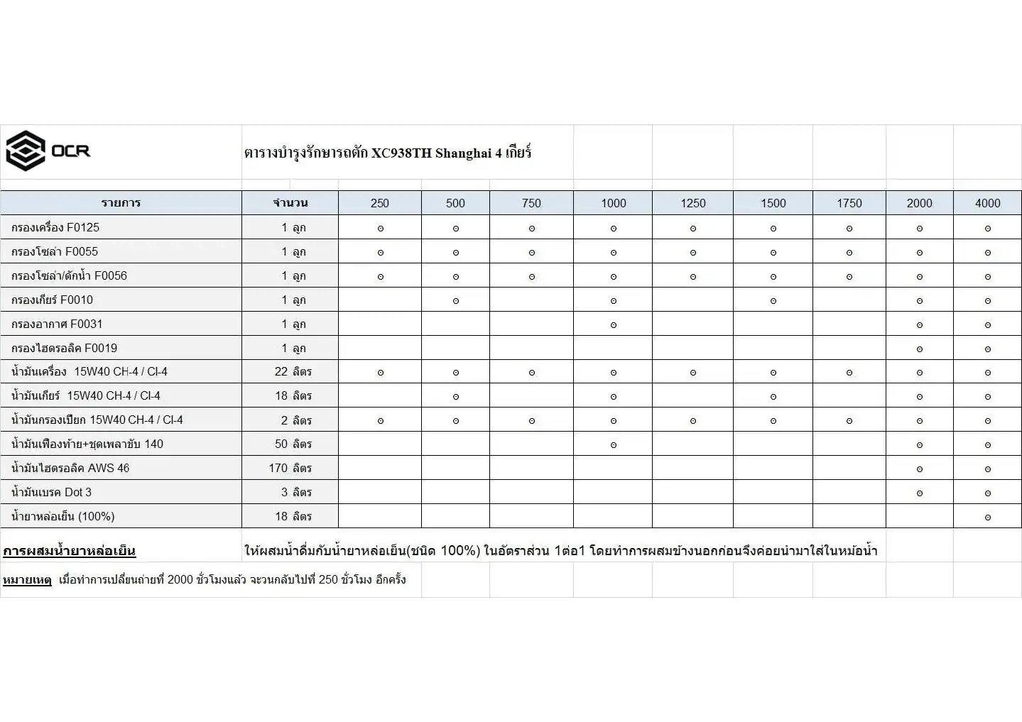 ตารางบำรุงรักษารถตัก รุ่น XC938TH Shanghai 4 เกียร์